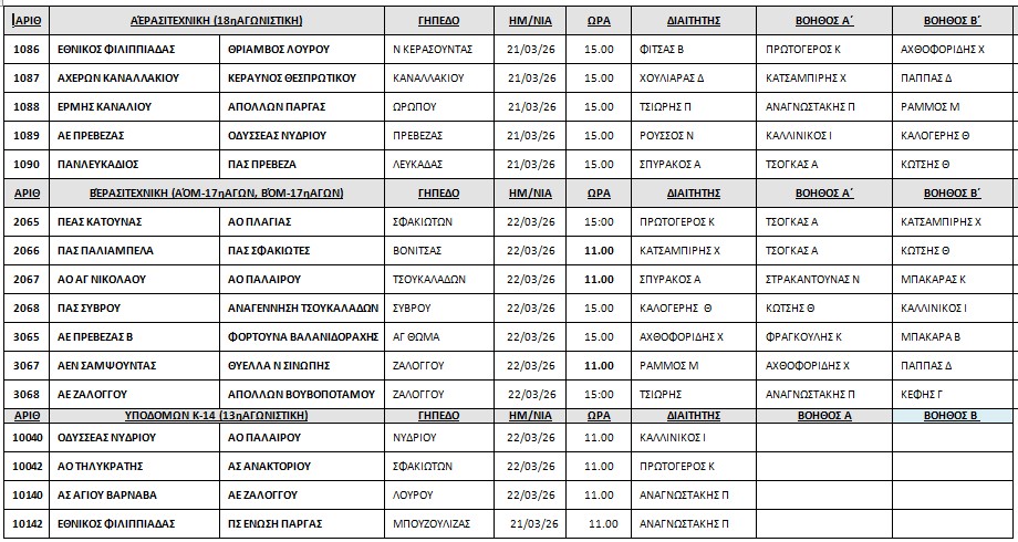 Ανακοινώθηκαν από την Επιτροπή Διαιτησίας της ΕΠΣ Πρέβεζας-Λευκάδας, οι διαιτητές που θα διευθύνουν τα παιχνίδια του Σαββατοκύριακου.