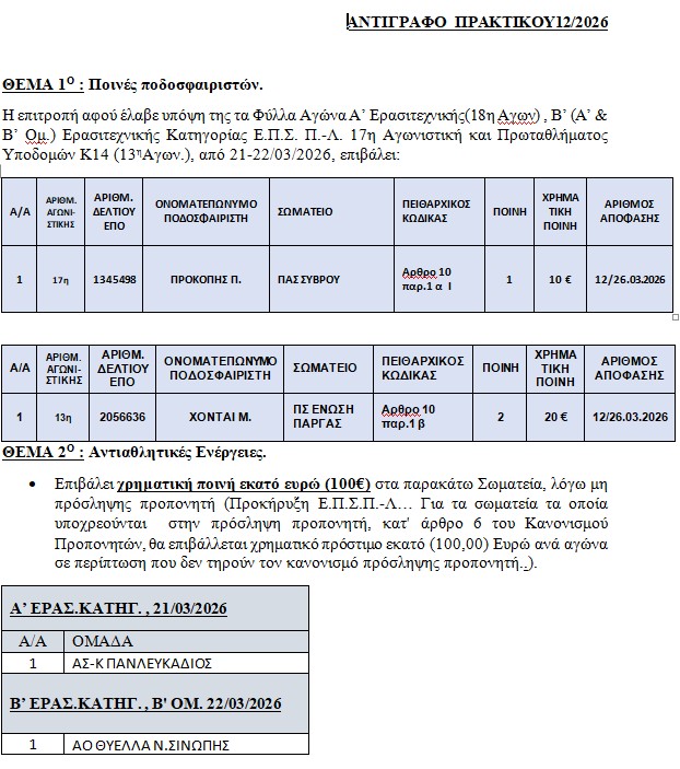 Το ποινολόγιο της ΕΠΣ Πρέβεζας-Λευκάδας