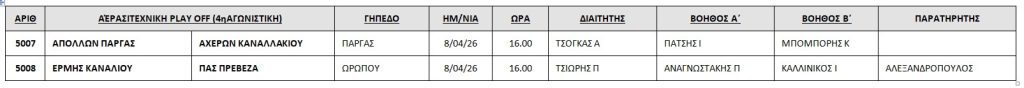 Το πρόγραμμα και οι διαιτητές των αγώνων της 4ης αγωνιστικής των Play Off της Α΄ ΕΠΣ Πρέβεζας-Λευκάδας.