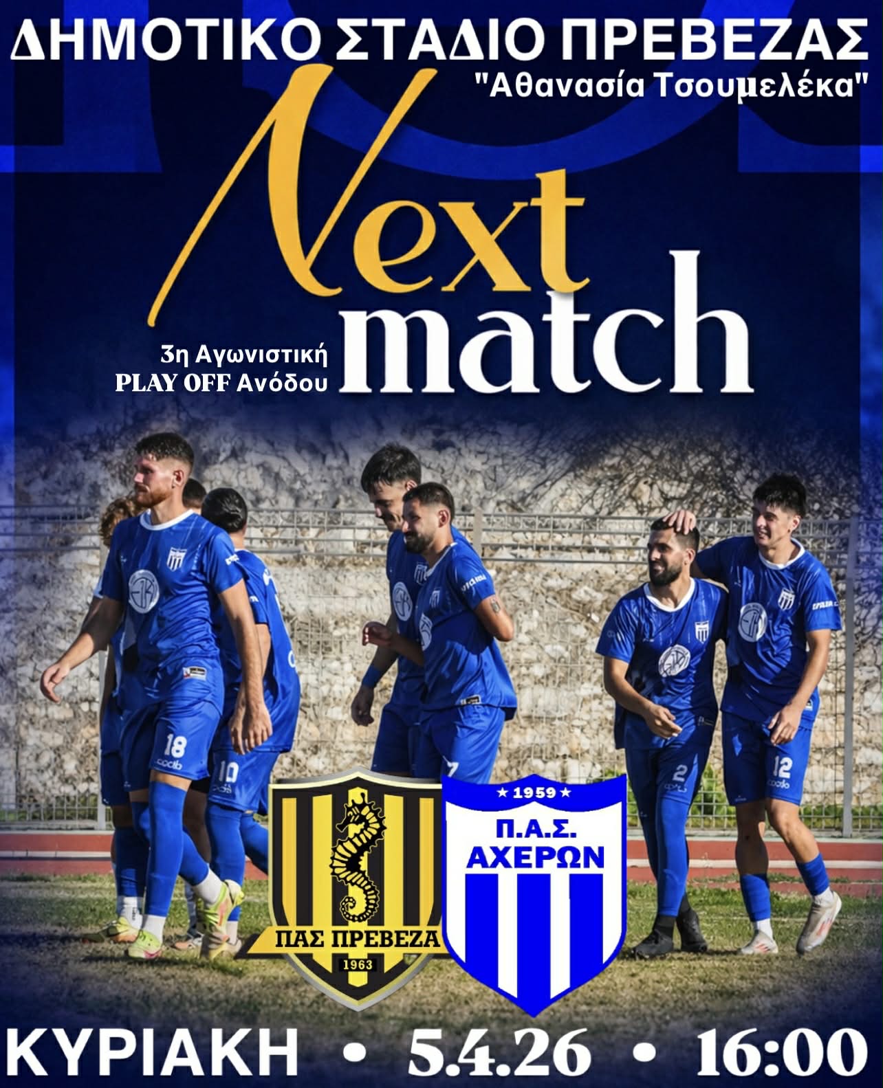 Ο ΠΑΣ ΑΧΕΡΩΝ Ο αντιμετωπίζει τον ΠΑΣ ΠΡΕΒΕΖΑ στο Στάδιο της ΠΡΕΒΕΖΑΣ την Κυριακή 5.4 ή . και ώρα 16:00, για την 3η αγωνιστική των PLAY OFF ν ανόδου της Α΄ ΕΠΣ Πρέβεζας-Λευκάδας.