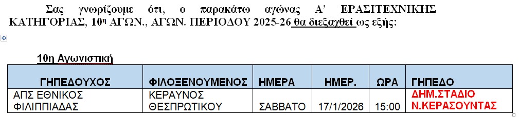 Η αναμέτρηση του Εθνικού Φιλιππιάδας με τον Κεραυνό Θεσπρωτικού το Σάββατο (17/1) για τη 9η αγωνιστική της Α΄ ΕΠΣ Π-Λ θα διεξαχθεί τελικά στη Νέα Κερασούντα, με την διοργανώτρια αρχή να ανακοινώνει την Τρίτη (13/1) την αλλαγή έδρας.