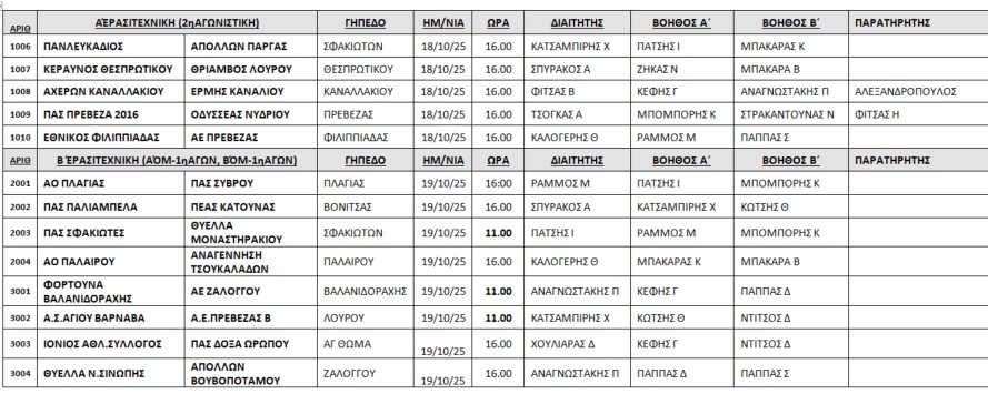Ανακοινώθηκαν από την Επιτροπή Διαιτησίας της ΕΠΣ Πρέβεζας-Λευκάδας, οι διαιτητές που θα διευθύνουν τα παιχνίδια του Σαββατοκύριακου σε Α’ και Β’ Κατηγορία.