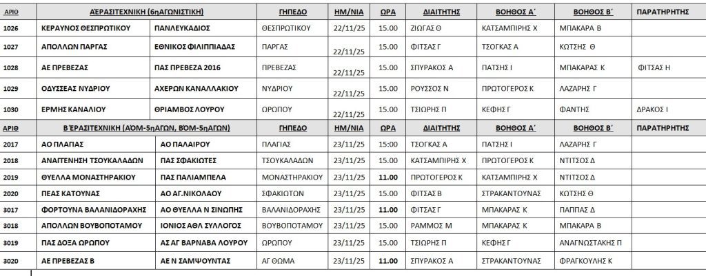Ανακοινώθηκαν από την Επιτροπή Διαιτησίας της ΕΠΣ Πρέβεζας-Λευκάδας, οι διαιτητές που θα διευθύνουν τα παιχνίδια του Σαββατοκύριακου σε Α’ και Β’ Κατηγορία.
