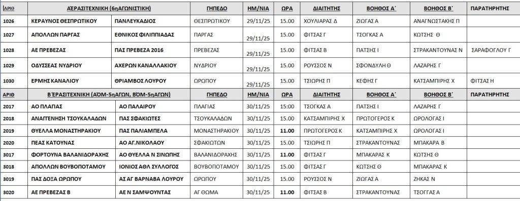 Ανακοινώθηκαν από την Επιτροπή Διαιτησίας της ΕΠΣ Πρέβεζας-Λευκάδας, οι διαιτητές που θα διευθύνουν τα παιχνίδια του Σαββατοκύριακου σε Α’ και Β’ Κατηγορία.