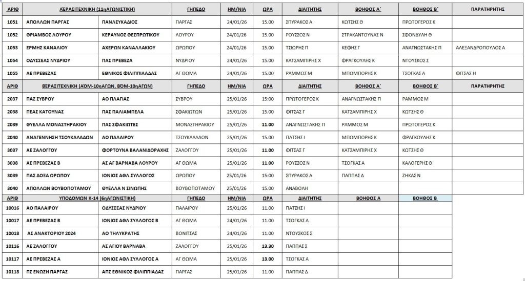 Ανακοινώθηκαν από την Επιτροπή Διαιτησίας της ΕΠΣ Πρέβεζας-Λευκάδας, οι διαιτητές που θα διευθύνουν τα παιχνίδια του Σαββατοκύριακου.