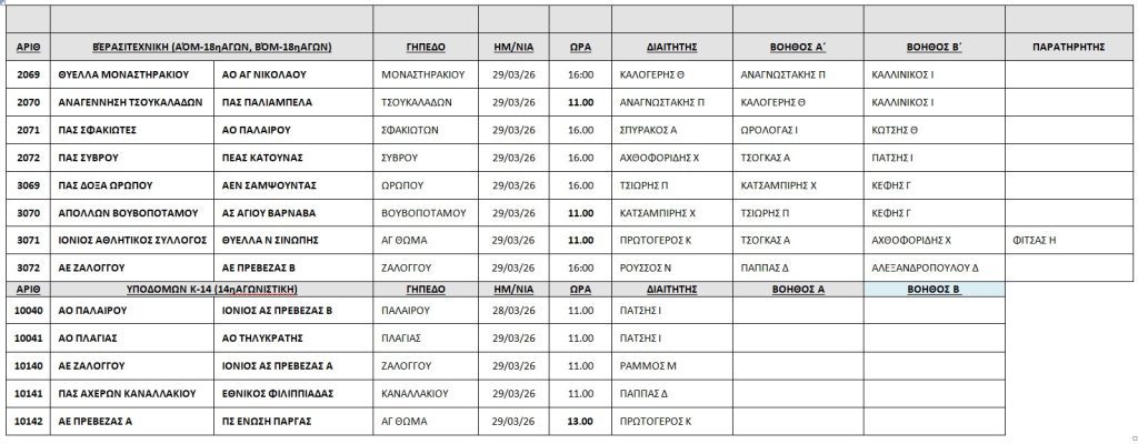 Ανακοινώθηκαν από την Επιτροπή Διαιτησίας της ΕΠΣ Πρέβεζας-Λευκάδας, οι διαιτητές που θα διευθύνουν τα παιχνίδια του Σαββατοκύριακου.