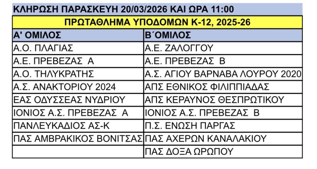 Η ΕΠΣ Πρέβεζας – Λευκάδας ενημερώνει τα σωματεία ότι η Κλήρωση του Πρωταθλήματος Υποδομών Κ-12 για την αγωνιστική περίοδο 2025-26 θα πραγματοποιηθεί την Παρασκευή 20 Μαρτίου 2026 και ώρα 11:00, στα γραφεία της Ένωσης (Αρκαδίου 17, Πρέβεζα).