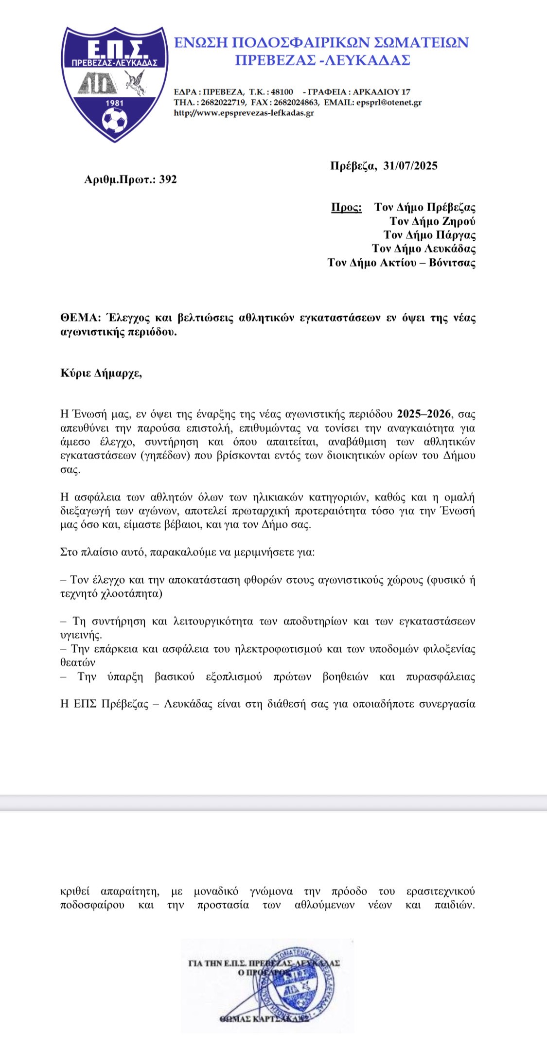 Θέμα: Καταγγελία για τις απαράδεκτες συνθήκες στις δημοτικές αθλητικές εγκαταστάσεις ποδοσφαίρου του Δήμου Πρέβεζας. Κύριε Δήμαρχε,...