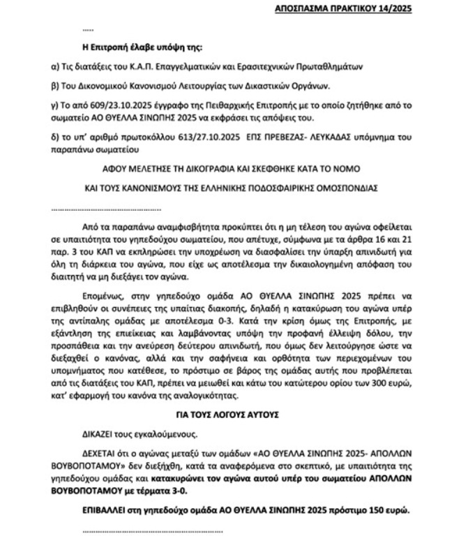 Ανακοινώθηκε από την Πειθαρχική Επιτροπή της ΕΠΣ Πρέβεζας-Λευκάδας το ποινολόγιο.