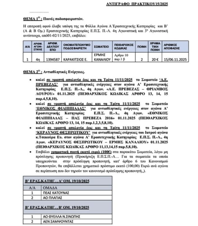 Το ποινολόγιο της ΕΠΣ Πρέβεζας-Λευκάδας