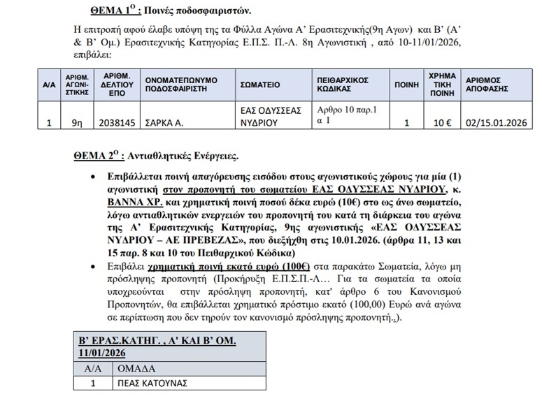 Το ποινολόγιο της ΕΠΣ Πρέβεζας-Λευκάδας
