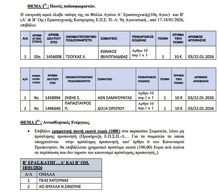 Το ποινολόγιο της ΕΠΣ Πρέβεζας-Λευκάδας