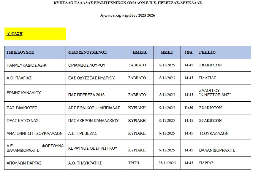 Το πρόγραμμα των αγώνων της Α’ φάσης του Κυπέλλου ΕΠΣ Πρέβεζας-Λευκάδας